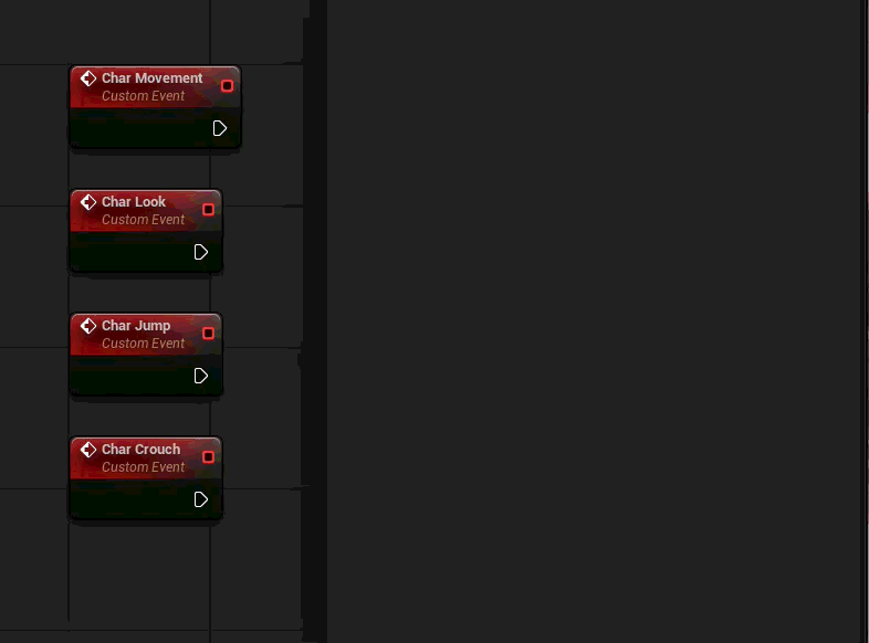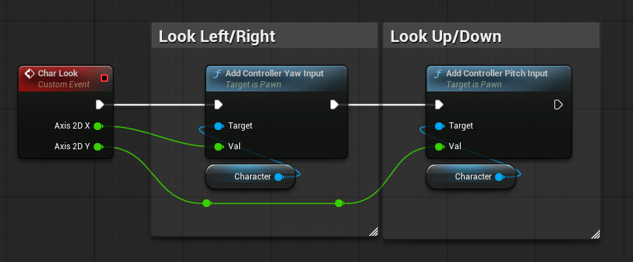 Setting up “Char Look” is very similar to the movement, but even more simple. You are using the Character class’s “Add Controller Yaw Input” node and “Add Controller Pitch Input Node” respectively.