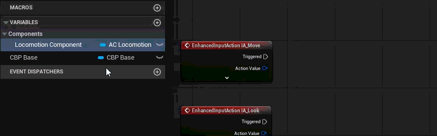 Above, we use the “Get Component by Class” function, called on CBP_Base, and tell it to find the “AC_Locomotion” class. Then we promote it to a variable named “Locomotion Component”.