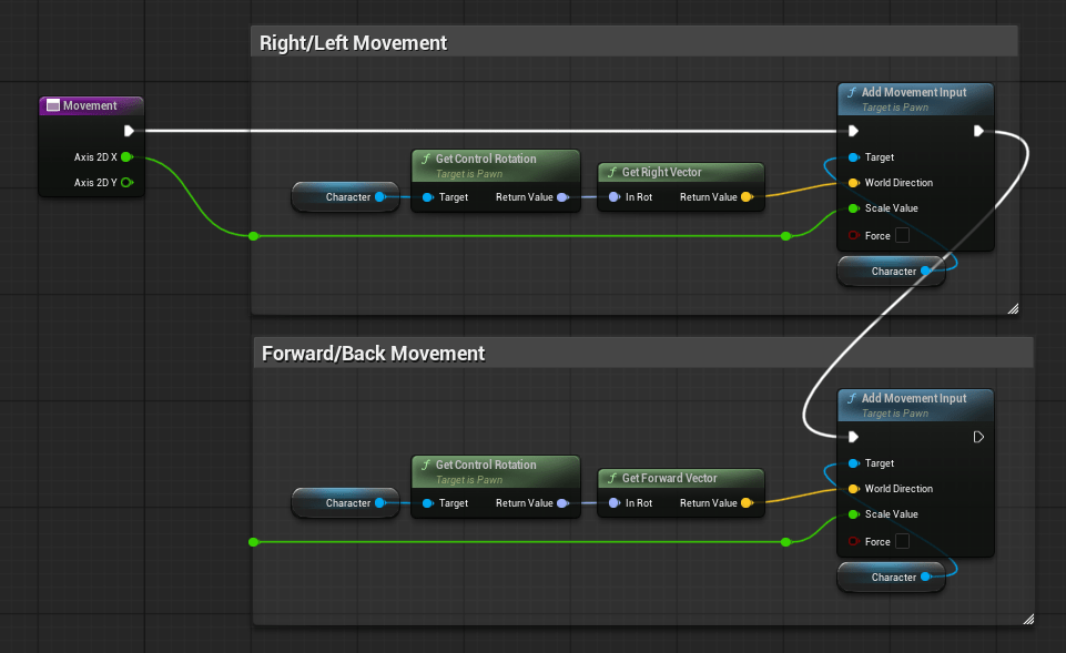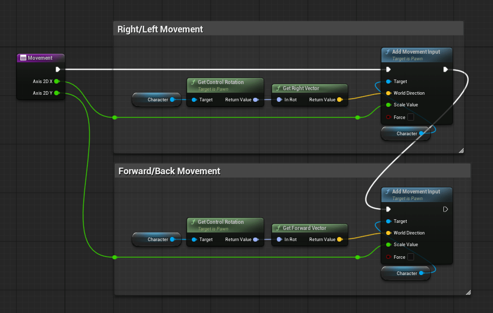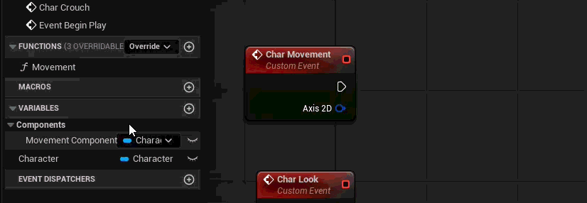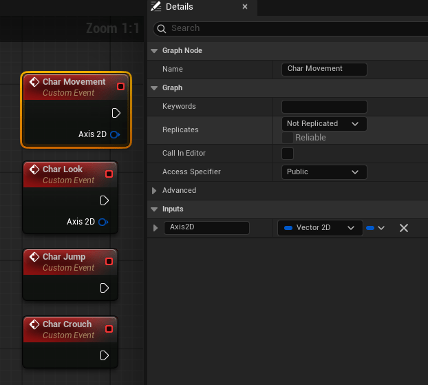 There is one more step, though. Both our “Char Movement” and “Char Look” events need Vector2D inputs in order to handle the movement axes we configured earlier.