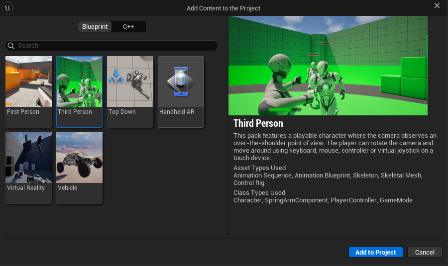 Select the “Third Person” content and then click “Add to Project”
