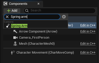 So with the Capsule component selected, click “Add” and then search for “Spring Arm” and add it.