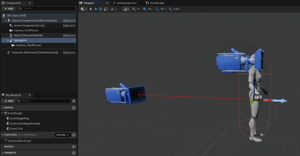 Third-person cameras typically take two components. Instead of just being a Camera, you add a “Spring Arm” component first, then attach your camera to that. This lets you control the camera better by manipulating the spring arm!