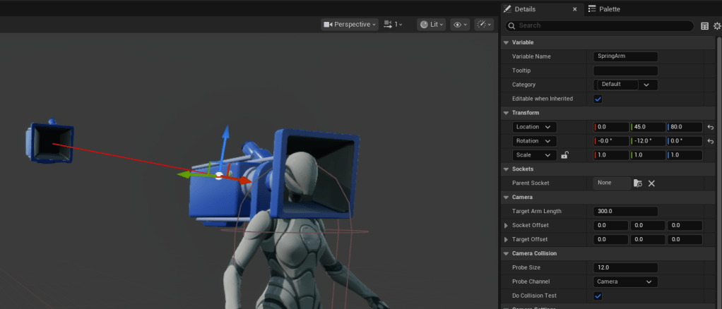 Once again, the camera is looking at our character’s ass. To fix this, we just need to move the SpringArm so it’s about head level and tilted a bit and offset a bit so that our character isn’t blocking our view.