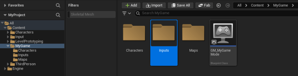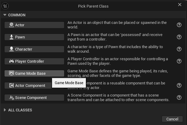 Open up your Content Drawer again under Content/MyGame/ create a new Blueprint of type “Game Mode Base”