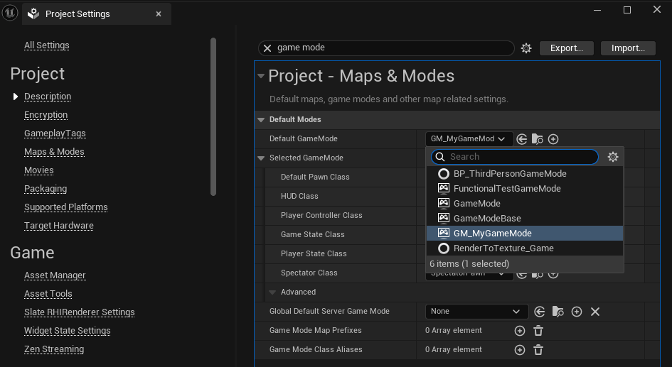We can set this as the default game mode for our entire project from Project settings…