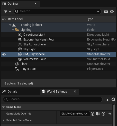 Or we can assign any game mode to a specific level by opening the level, switching to the “World Settings” tab/panel, and selecting our desired game mode from the “GameMode Override” dropdown.