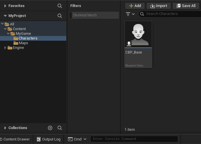 Next, create the folder Content/MyGame/Characters and inside that folder, create a new Blueprint Class of type Character and name it CBP_Base (CBP means “Character Blueprint”).