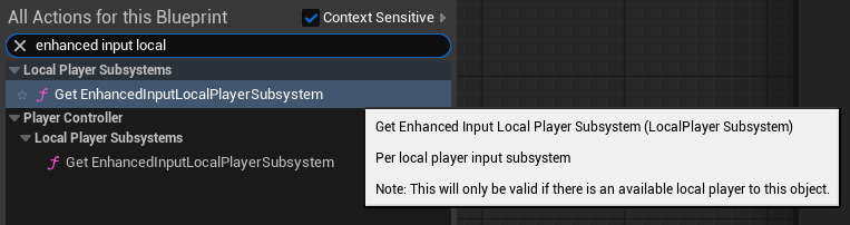 To the right of your Branch, right-click to add a new node and search for “enhanced input local” – this will narrow down the results. Now select “Get EnhancedInputLocalPlayerSubsystem” to add that node.