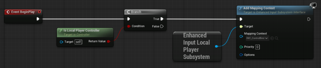 Finally, we just need to tell the “Add Mapping Context” node about our IMC_ControlBindings, by selecting it in the “Mapping Context” dropdown.