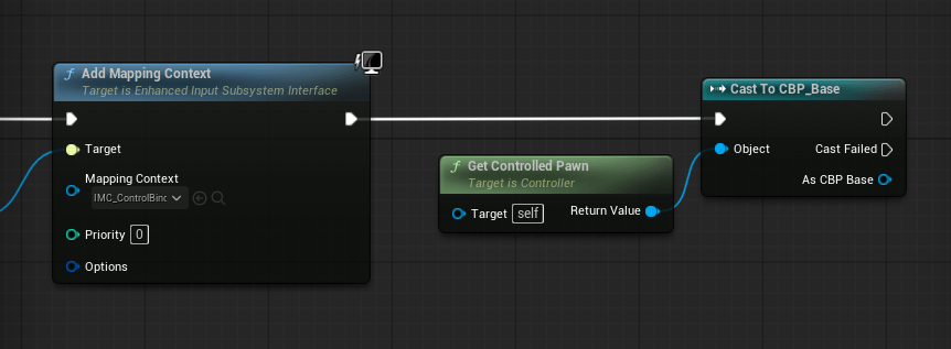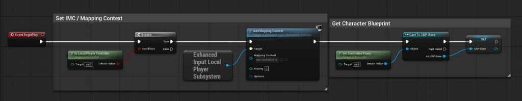 Let’s start by expanding our Event BeginPlay logic. After your “Add Mapping Context” node, right click anywhere and add the “Get Controlled Pawn” node. Then create a wire from that Return Value and choose “Case to CBP_Base” (that’s the character class we created).