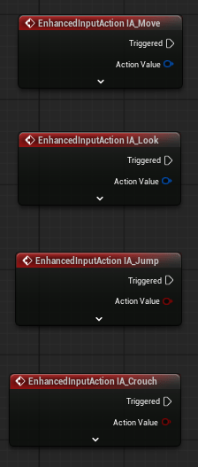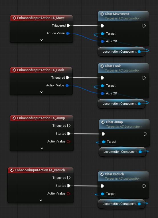 Now hook up all the others the same way. Since Jump and Crouch don’t need any axis inputs you simply need to call them. When done, you should have something like this…