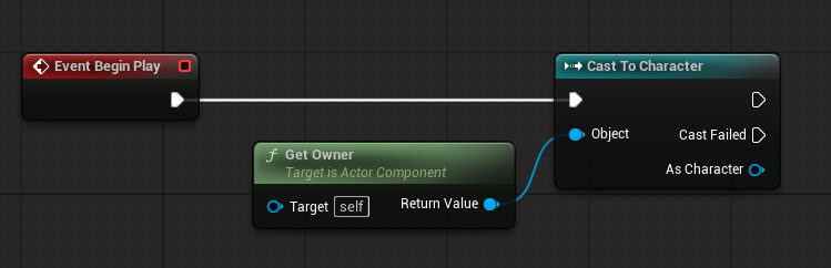 So near the “Event BeginPlay” event, right click and add a “Get Owner” node. Next, pull off the “Return Value” pin and create a “Cast to Character” node.