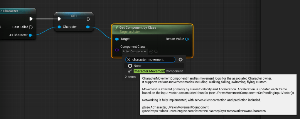 Pull off the blue pin and – just like we did earlier – add a “Get Component by Class” node. This time, however, we want to select “Character Movement Component” from the drop-down.