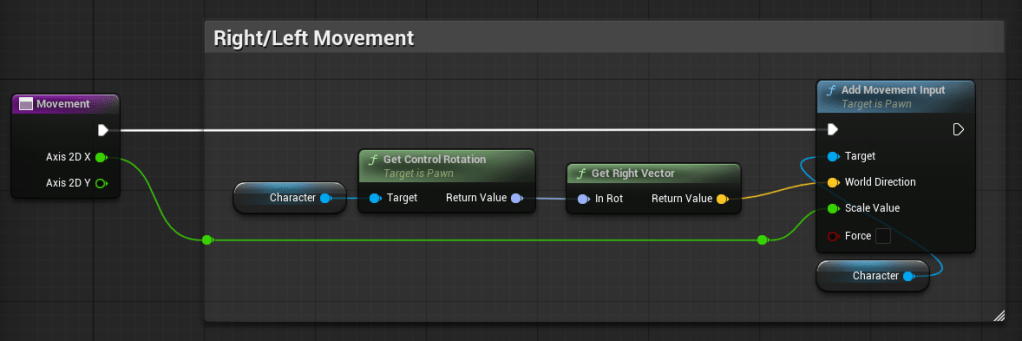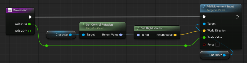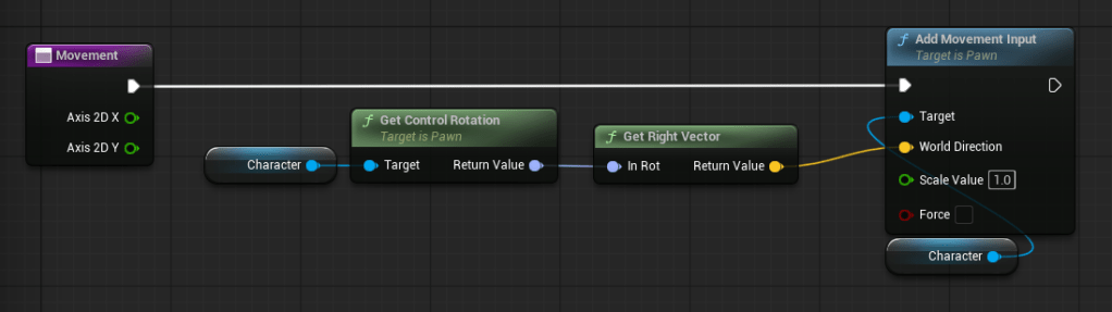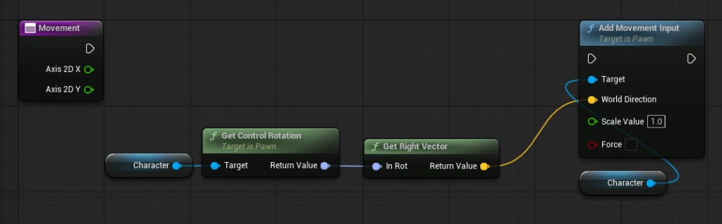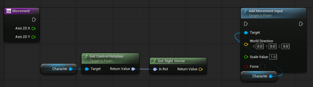 Now, connect “Get Right Vector” to your “Add Movement Input” “World Direction” pin…
