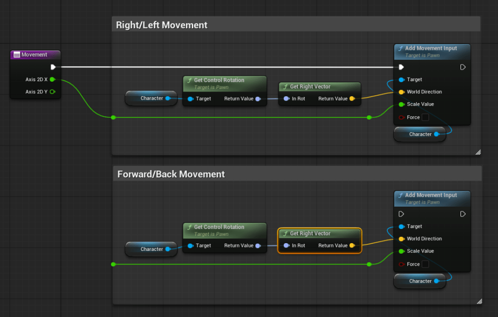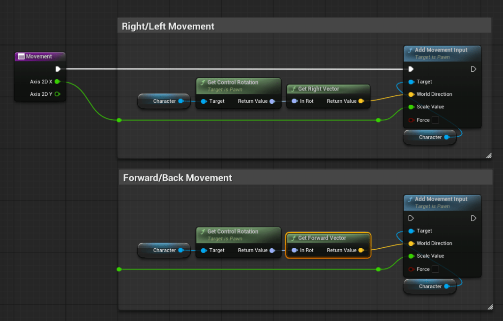 Next, DELETE the “Get Right Vector” node and replace it with “Get Forward Vector”. This is the Y axis that will let us move forward/backward.