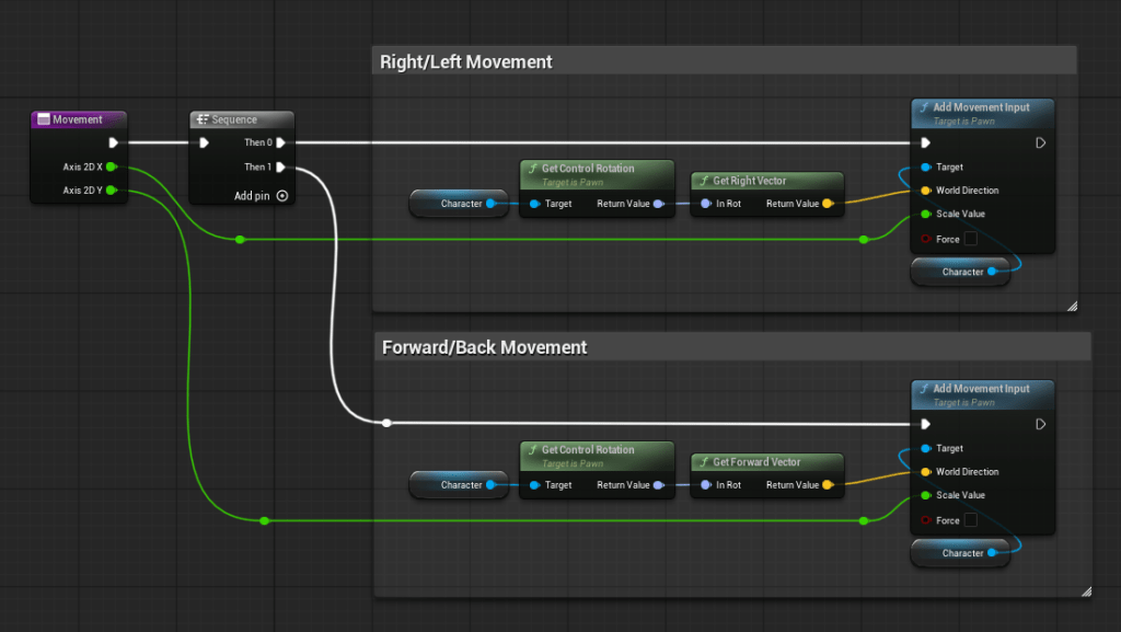 Now, simply connect your IA_Move’s “Triggered” pin to your Char Movement and then connect IA_Move’s “Action Value” to your “Char Movement” “Axis 2D”, as shown below.