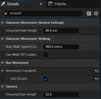 Under the Details panel, search for “crouch” and make sure “Can Crouch” is checked.