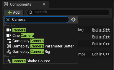 Now, select the SpringArm component you just added and then click “Add” again. Now, search for “Camera” and add a Camera under your SpringArm. Name this camera “Camera_ThirdPerson” to distinguish it from the first one.