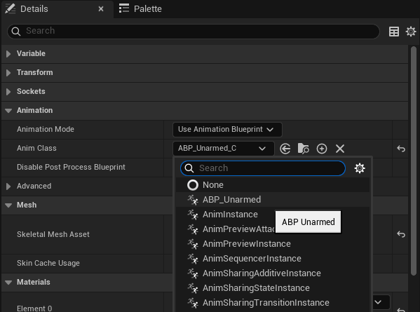 In the Details panel (far right), find the “Anim Class” setting and select “ABP_Unarmed” from the drop-down.